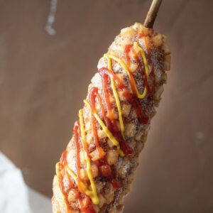 Living in Korea, I make this home-style version the same way I see it sold at street stalls, with thick batter, melty mozzarella or sausage, and that classic sugar, ketchup, and mustard finish. The result is the same crispy Korean corndog texture you expect, made easily at home.
