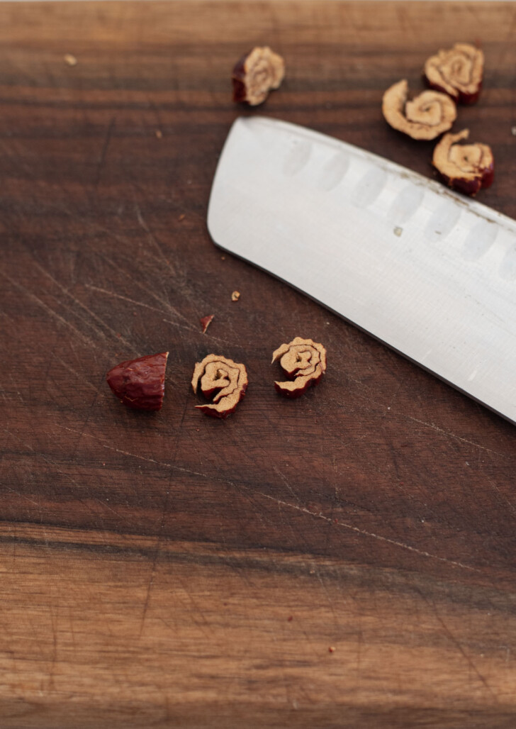 Korean desserts often use thinly sliced dried jujube as a garnish. To make the little “flower” curls, cut around the seed to remove the flesh in one strip. Roll the strip tightly, then slice it into thin rounds. They naturally unfurl into small red blossoms — simple but pretty on yakshik, shikhye, or sujeonggwa (cinnamon drink).