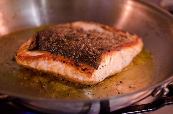 FLIP and sear on the flesh side, another 5 minutes. You will see the fish will leak lots of oil.