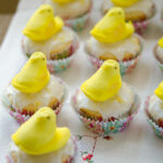 For the glaze, mix all the glaze ingredients well until smooth. Spoon over the cupcakes, and decorate with marshmallow peeps as you like.